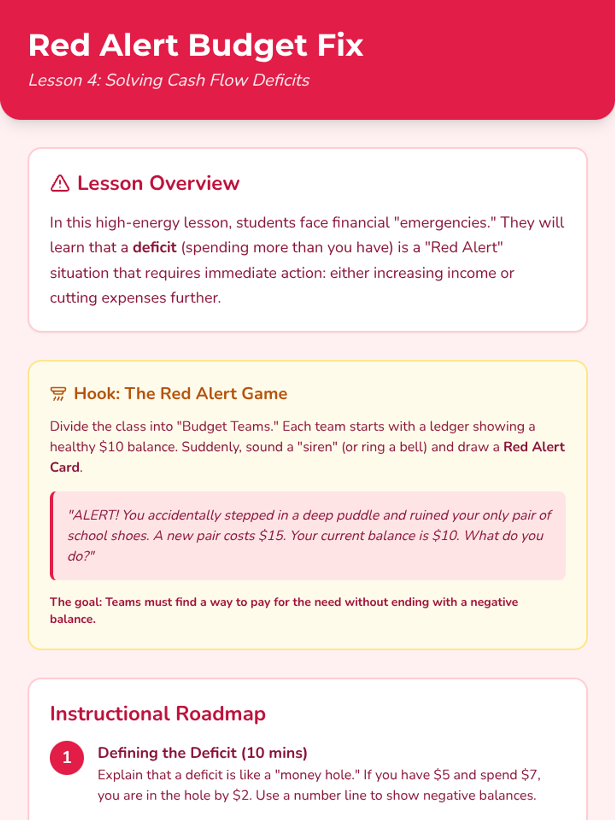 Challenges students to solve budget emergencies and navigate financial deficits using problem-solving strategies.