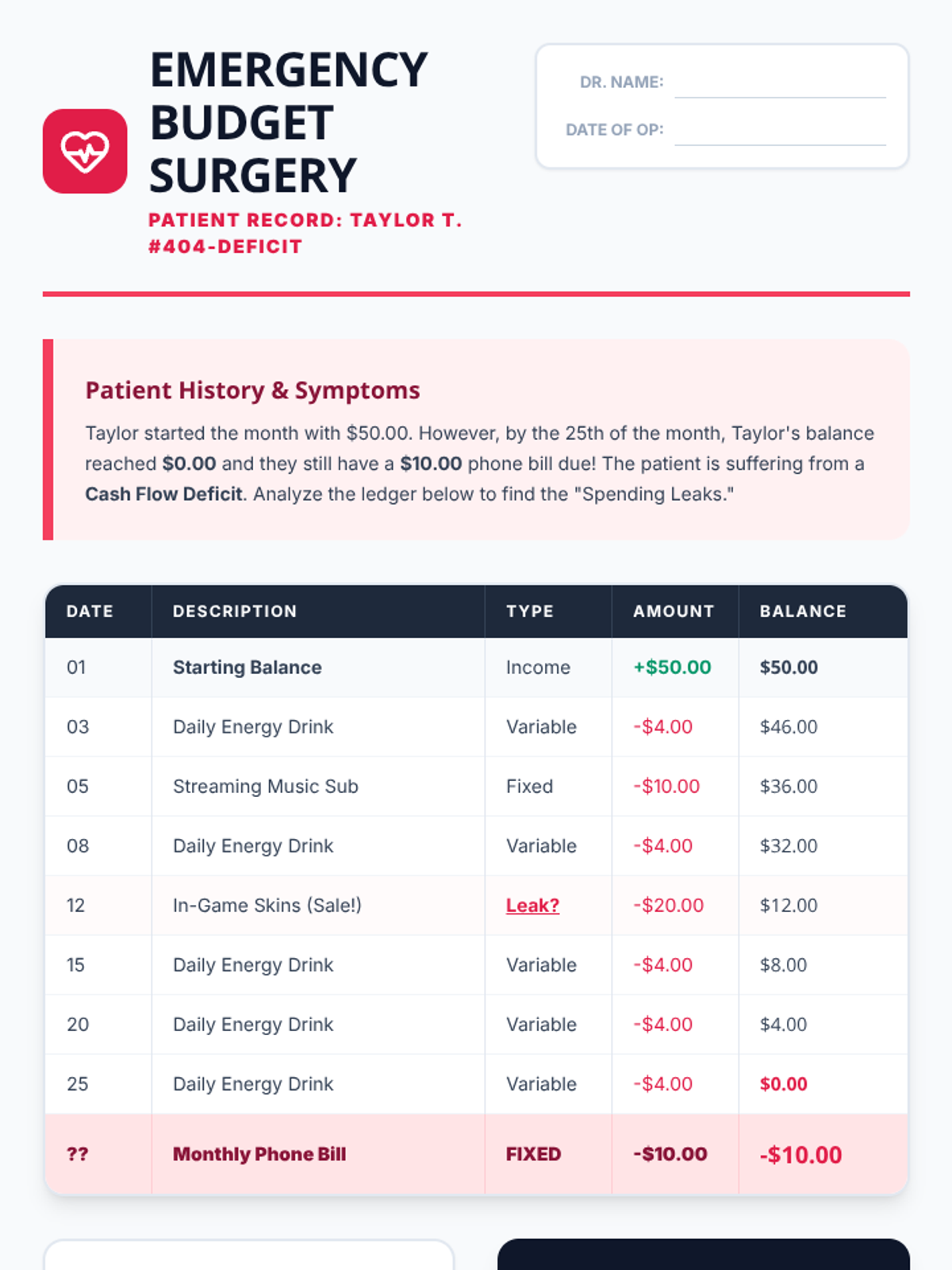 Students analyze pre-filled ledgers to identify deficits and 'spending leaks', acting as budget doctors to fix financial health.