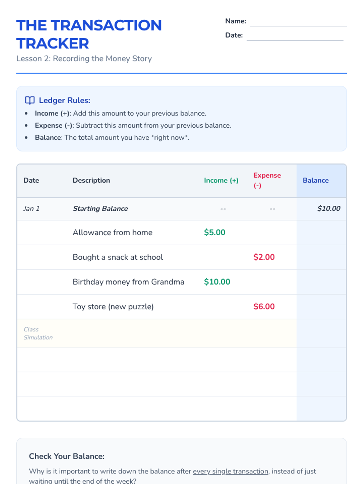 Students define income and expenses and practice the foundational skill of recording transactions in a ledger to maintain a running balance.
