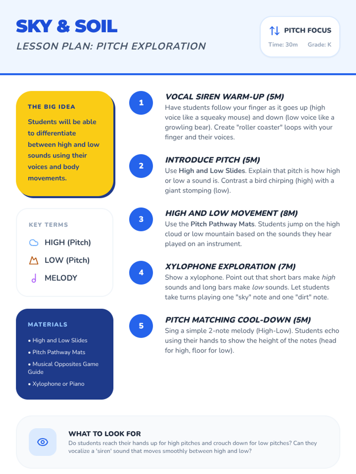 A Kindergarten music lesson plan focused on pitch, using movement and vocalization to explore high and low sounds.