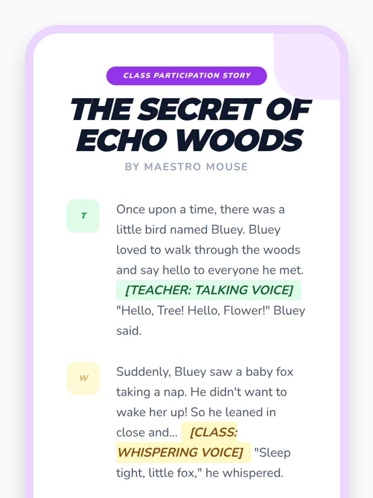 An interactive story for Kindergarten music class where students participate by using different voice types (speaking, singing, whispering, calling) as the narrative progresses.