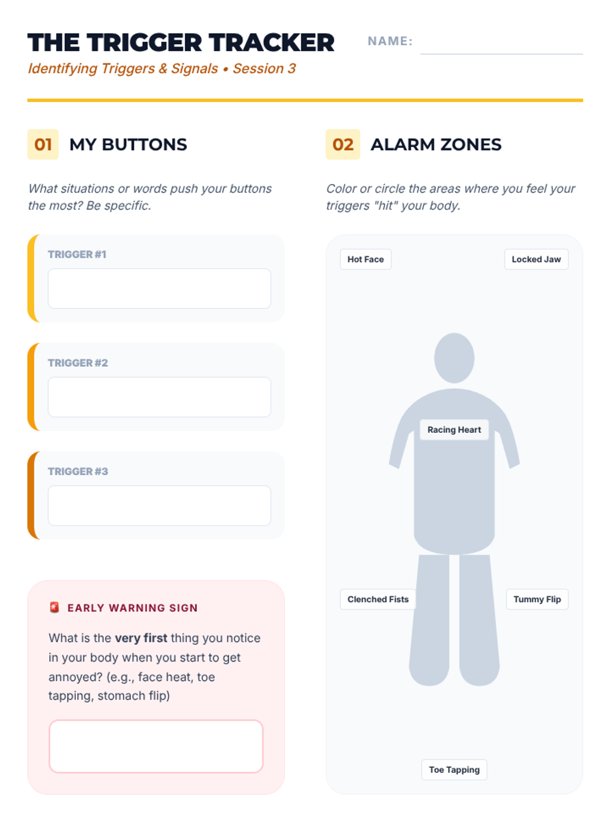 Worksheet for Session 3 that helps students identify personal triggers and map out the physical warning signs their bodies give.