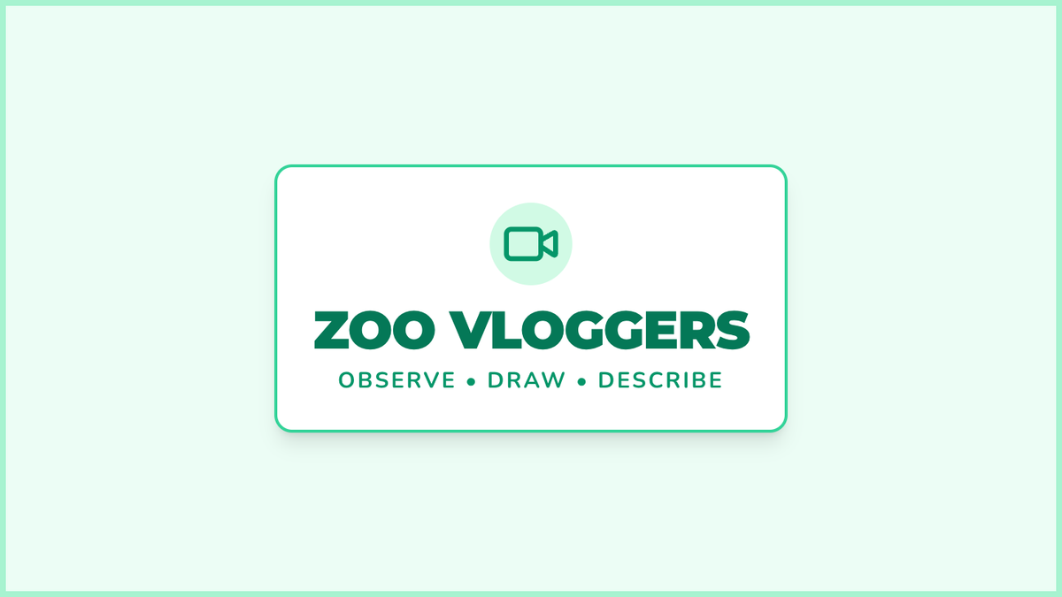 A visual presentation for the 'Zoo Vloggers' lesson, featuring the 'Me at the zoo' video, discussion prompts about animal observation, and instructions for the student activity.