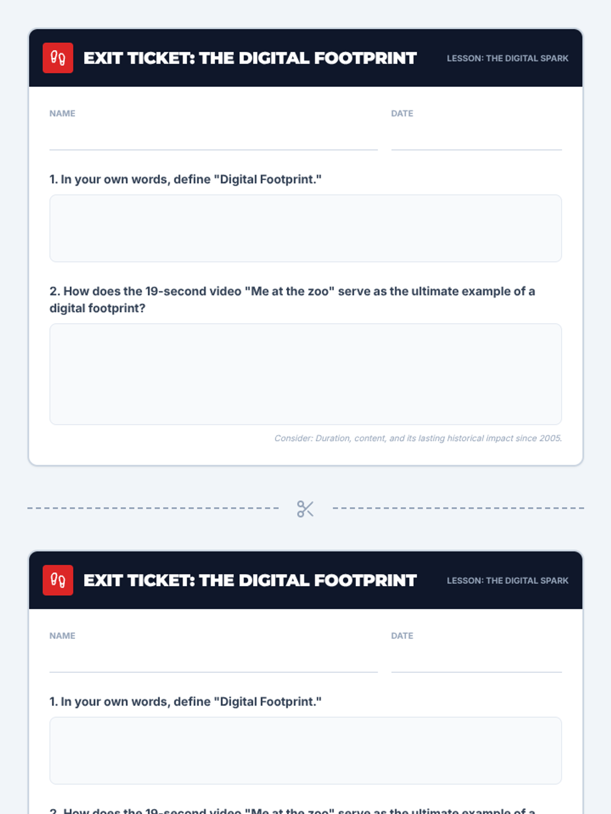 Teacher guide for the Digital Footprint lesson, including lesson plan, discussion prompts, video context, and transcript.