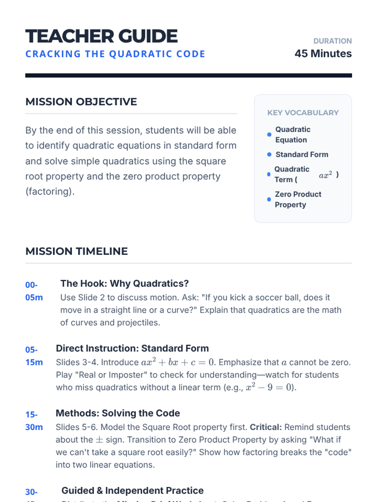 A comprehensive teacher guide for the 'Cracking the Quadratic Code' lesson. Includes a 45-minute pacing guide, key vocabulary, common student misconceptions, and differentiation strategies.