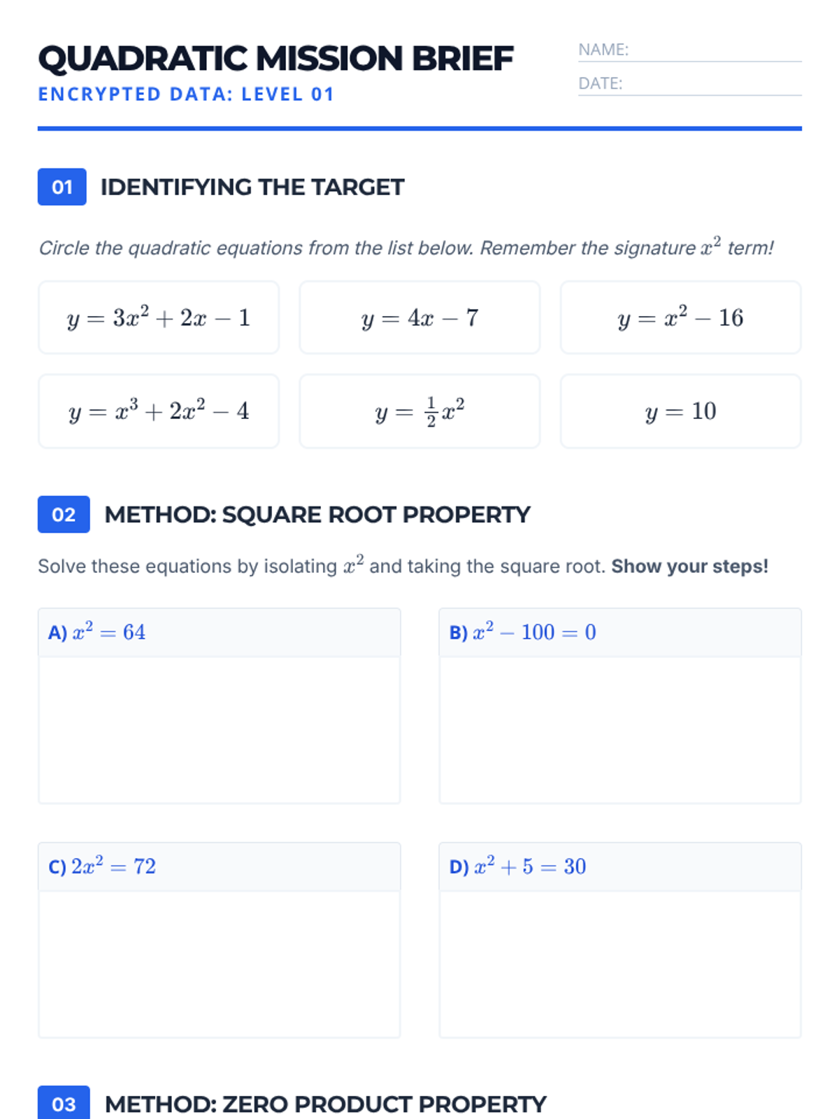 A structured practice worksheet for 9th-grade students to identify quadratic equations and solve them using the square root property and factoring. Features a 'mission brief' theme with dedicated space for student work.