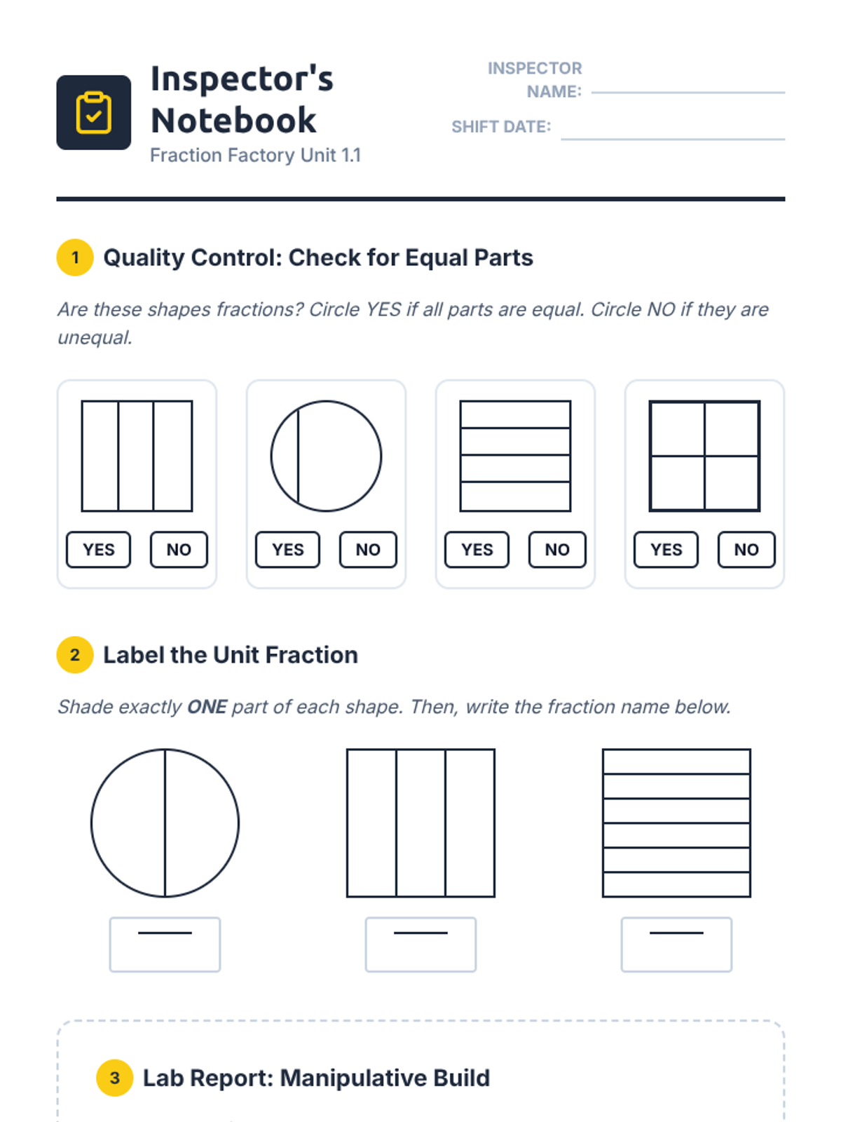 A student worksheet for identifying and naming unit fractions, designed with a 'Fraction Factory' theme. Includes sections for identifying equal parts, shading unit fractions, and reporting on manipulative work.