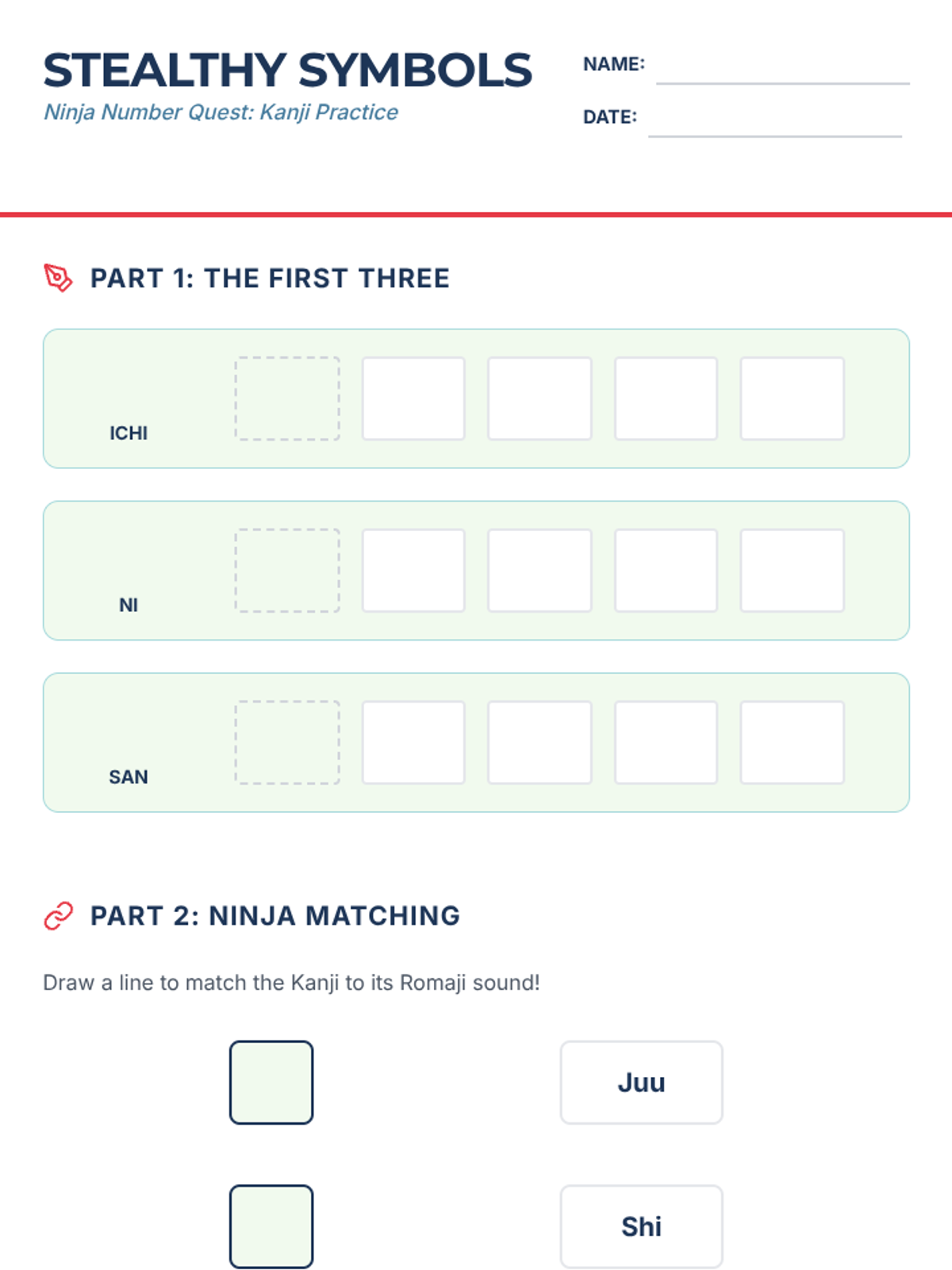 A student worksheet for practicing Japanese number kanji (1-3) and matching exercises for 4-10. Includes a counting assessment at the end.