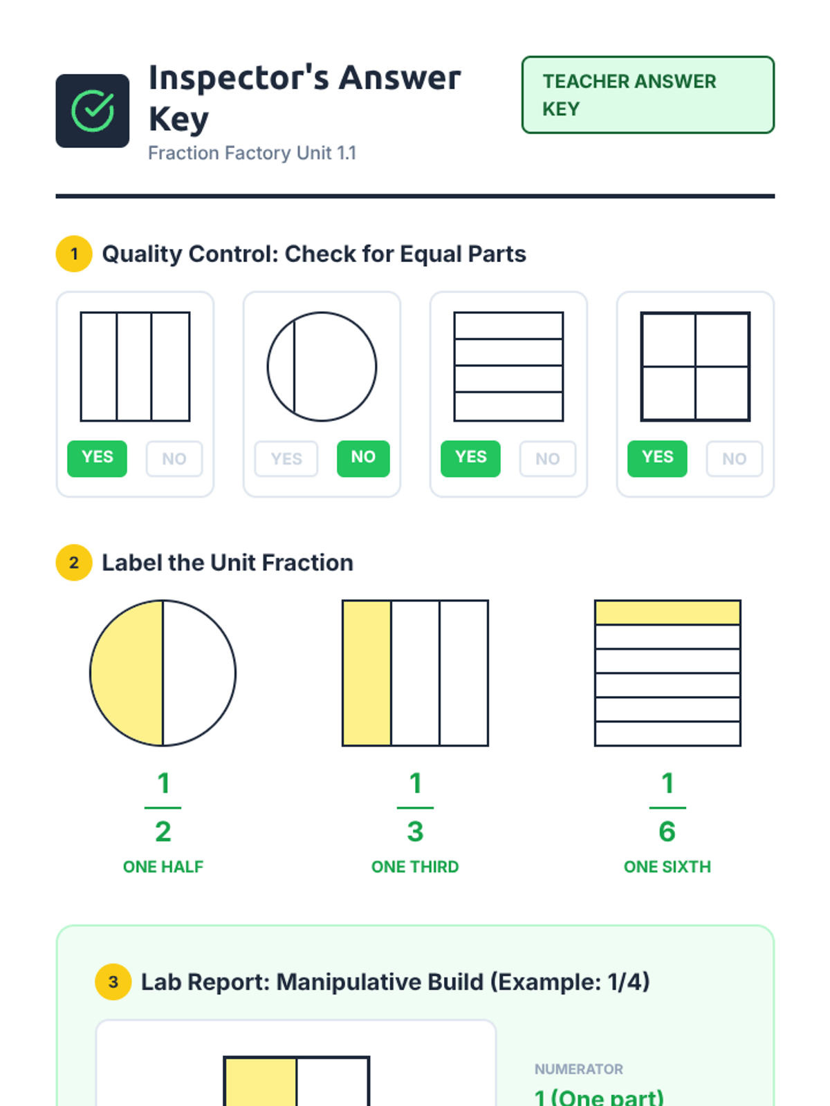 An answer key for the Inspector Notebook Worksheet, providing correct identification of equal parts and correctly labeled unit fractions.