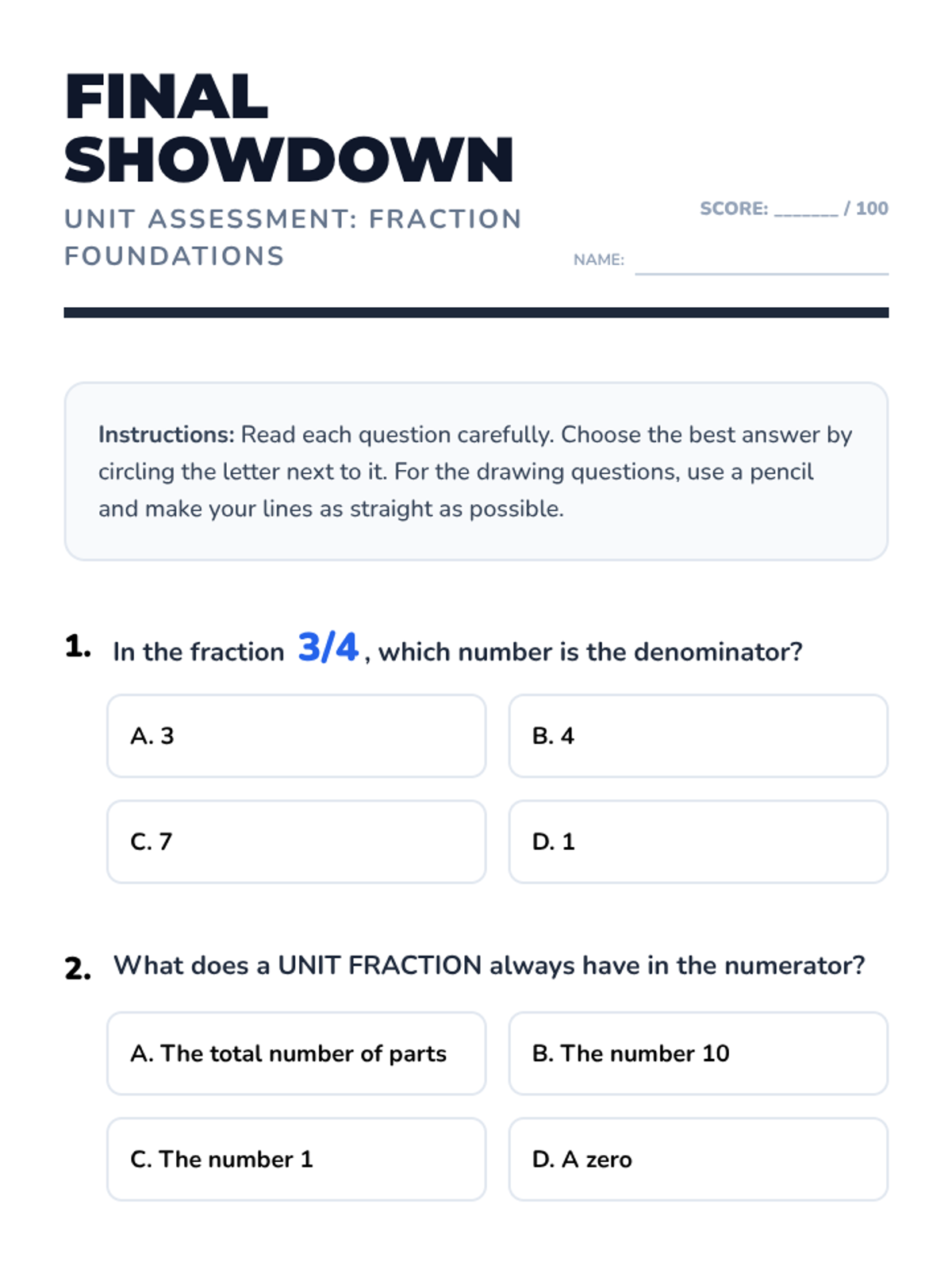 Cumulative multiple-choice assessment for 4th graders covering fraction vocabulary, unit fractions, and model identification.