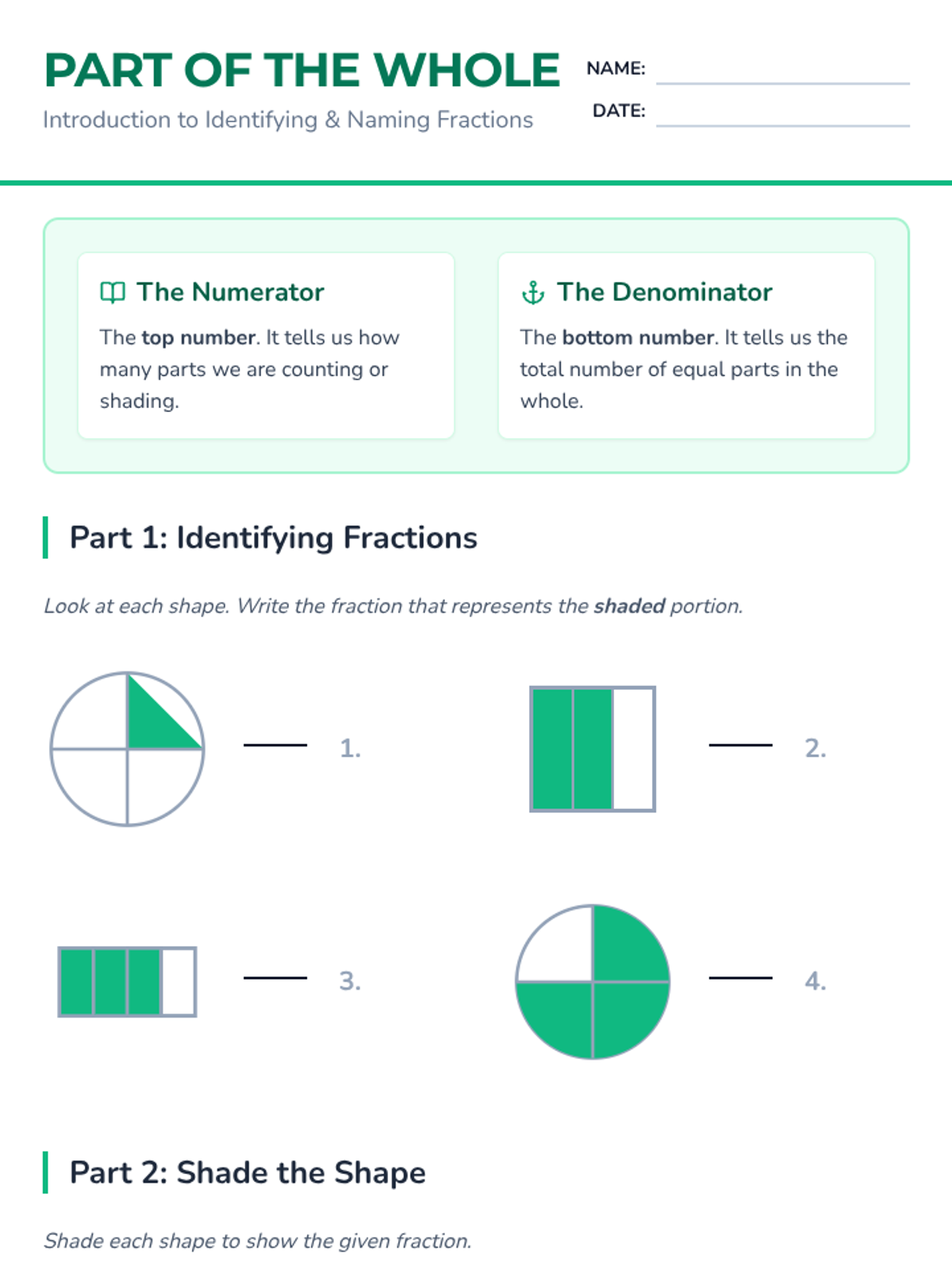 An introductory worksheet for 4th graders to identify and name fractions using visual models (circles, rectangles, and grids). Includes shading exercises and a critical thinking prompt.