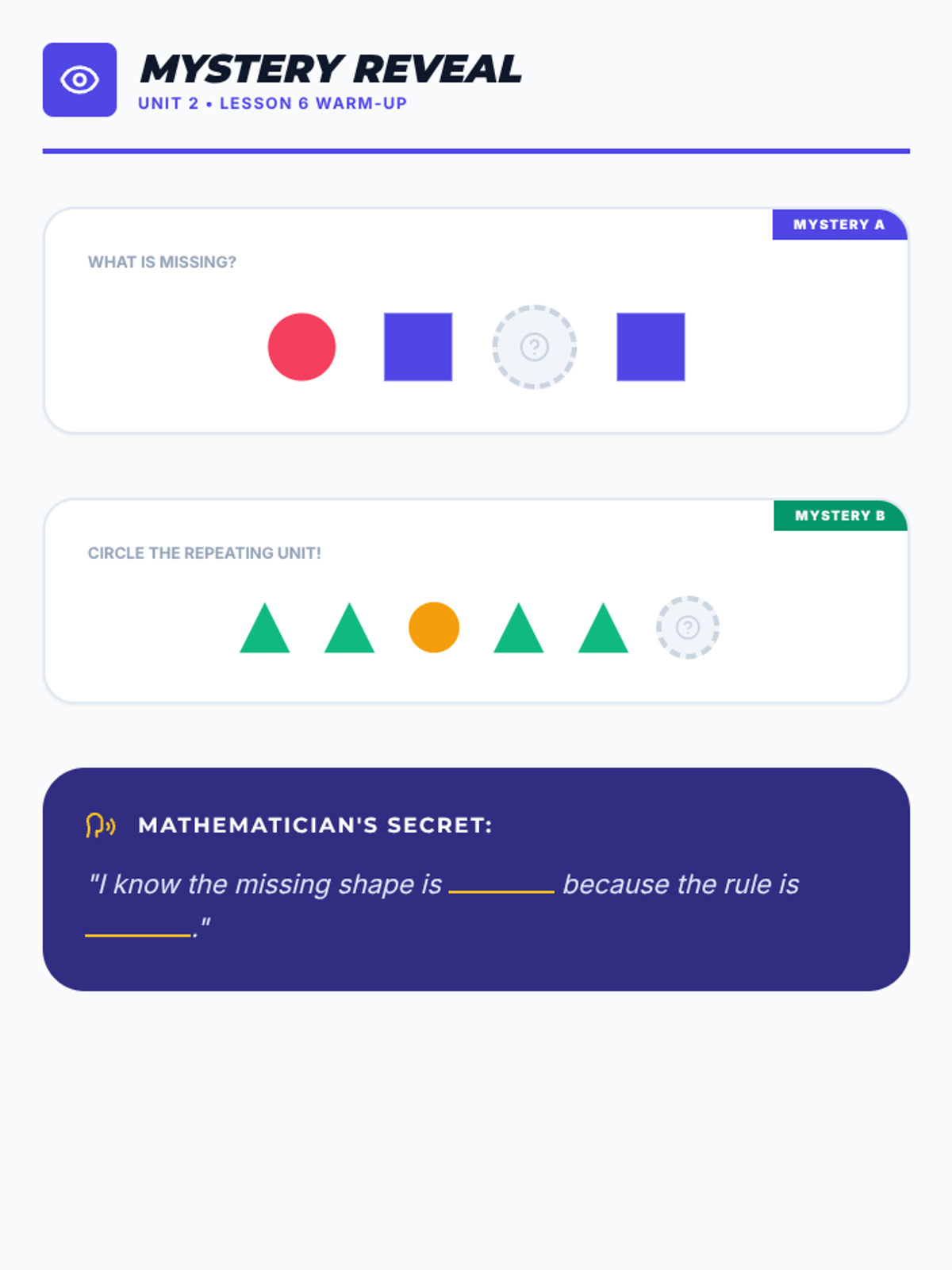 A visual warm-up activity featuring two 'mystery' patterns with missing elements. Designed to spark discussion about identifying and justifying pattern rules.
