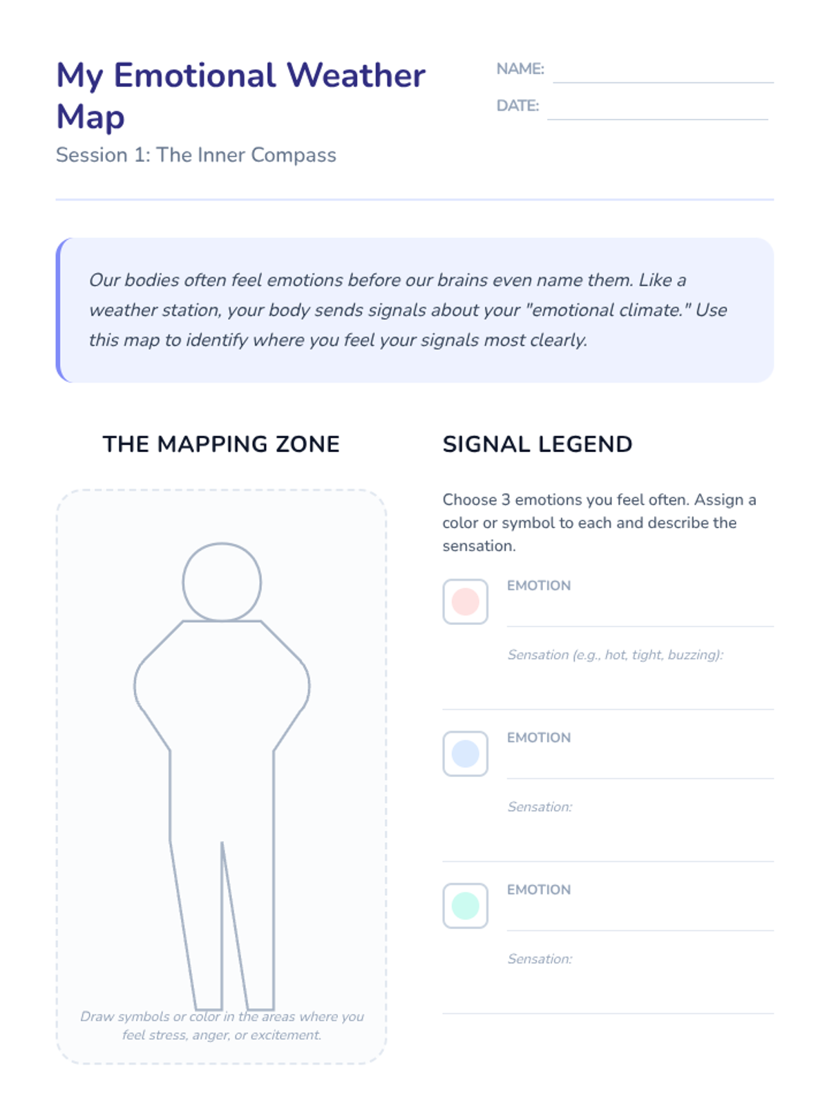 A student worksheet for identifying physiological signals of emotions. It features a body mapping activity where students color or mark areas where they feel physical sensations associated with specific feelings.