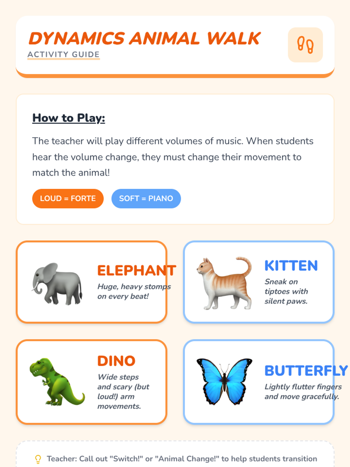 Instructions for a kinesthetic activity where students match their movement intensity to musical dynamics using animal metaphors.