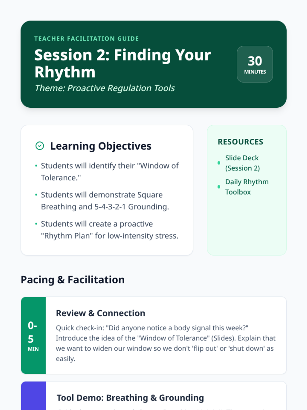 Teacher-facing facilitation guide for Session 2. Includes pacing, demonstration instructions for regulation tools, and a trauma-informed tip regarding breathing exercises.