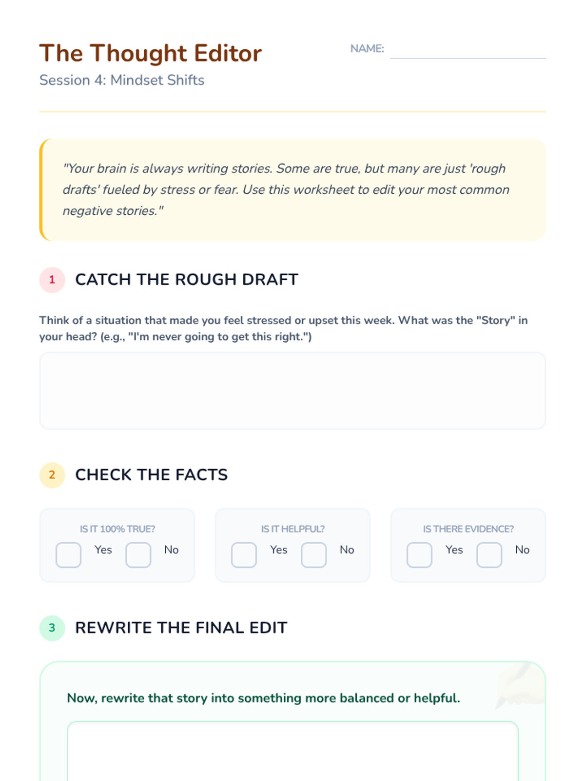 A student worksheet for Session 4, guiding students through the 'Catch-Check-Change' reframing technique to identify and edit negative self-talk.