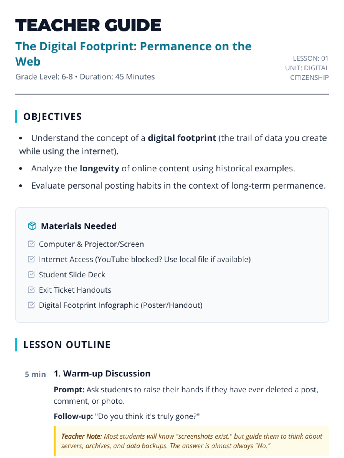 Teacher guide for the Digital Footprint lesson, including lesson plan, discussion prompts, video context, and transcript.