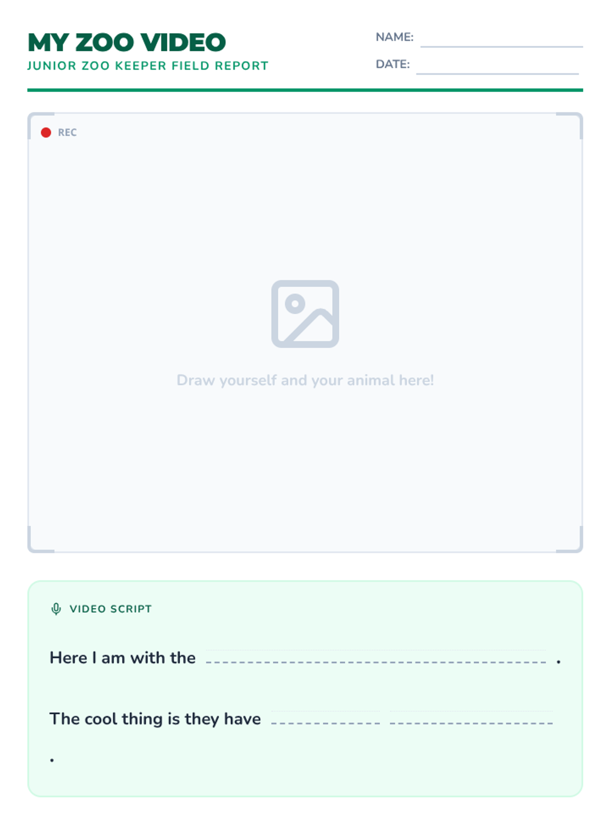 A specialized drawing and writing sheet for students to illustrate themselves with an animal and complete a descriptive sentence frame.