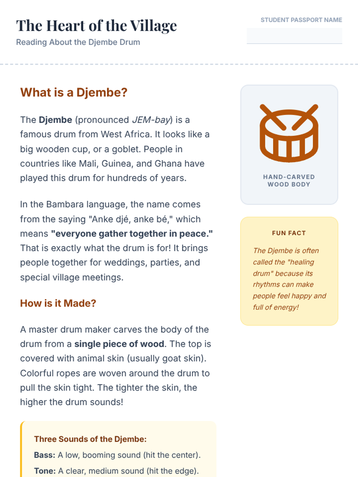 Informative reading passage about the Djembe drum, its cultural origins, construction, and the three primary sounds it produces, followed by comprehension questions.