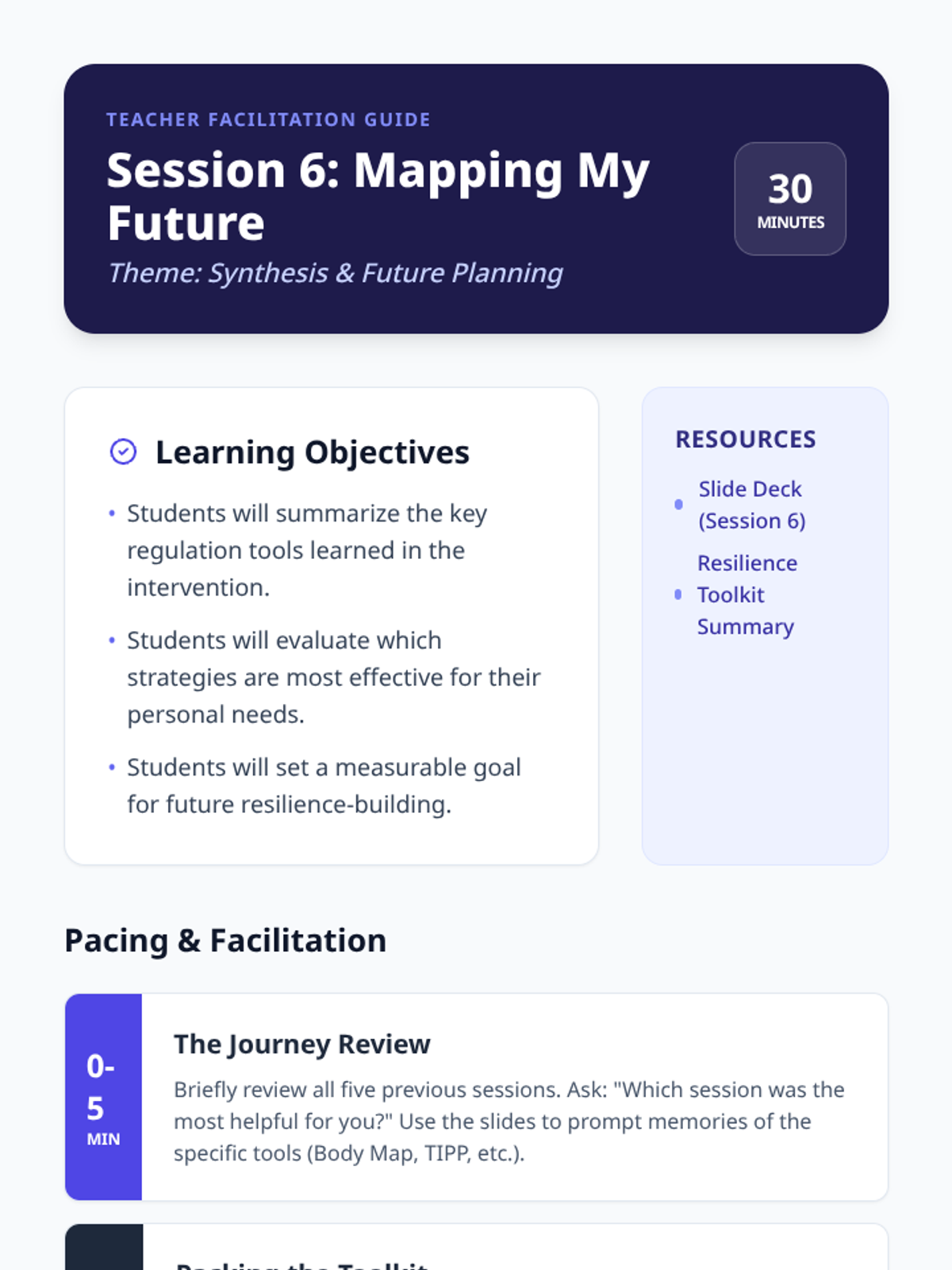 Final facilitation guide for Session 6. Provides instructions for synthesizing the 6-week program, helping students select their best tools, and planning for long-term maintenance of skills.
