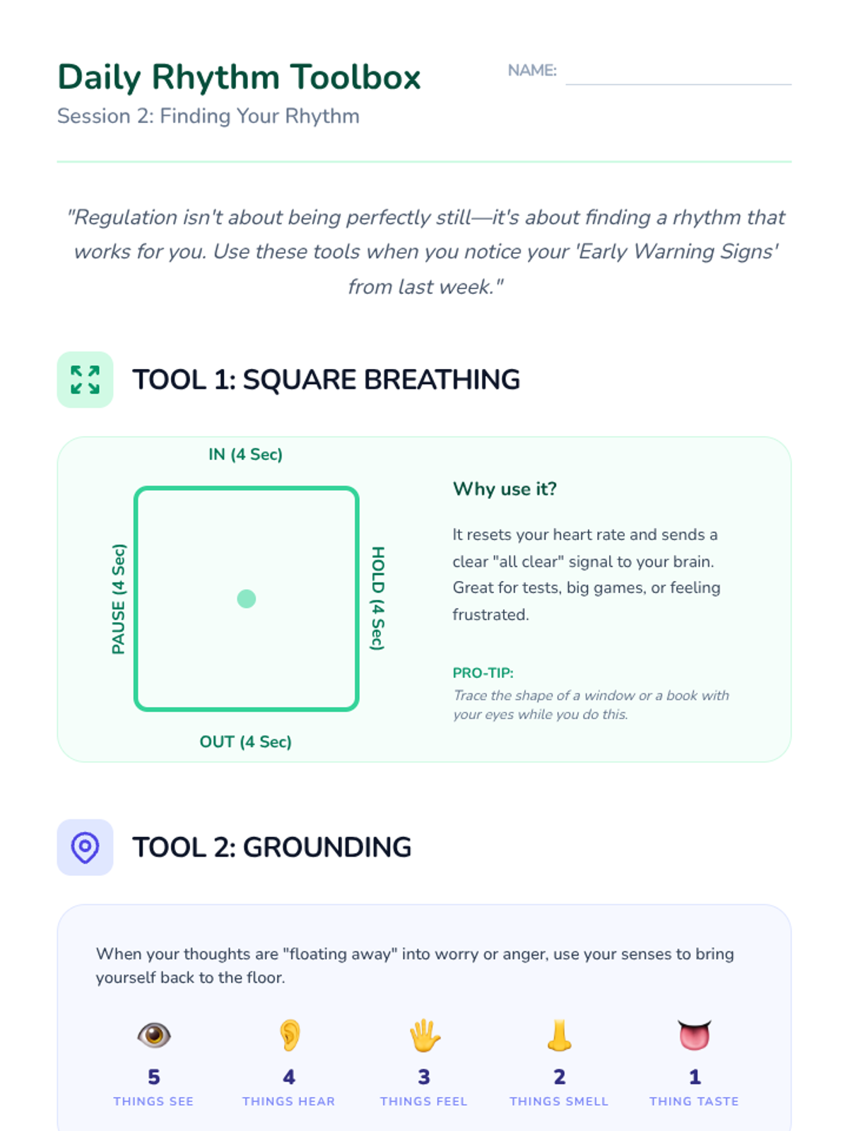 A student reference and practice sheet for Session 2. It provides clear, visual instructions for Square Breathing and 5-4-3-2-1 Grounding, along with a simple 'regulation plan' for students to complete.