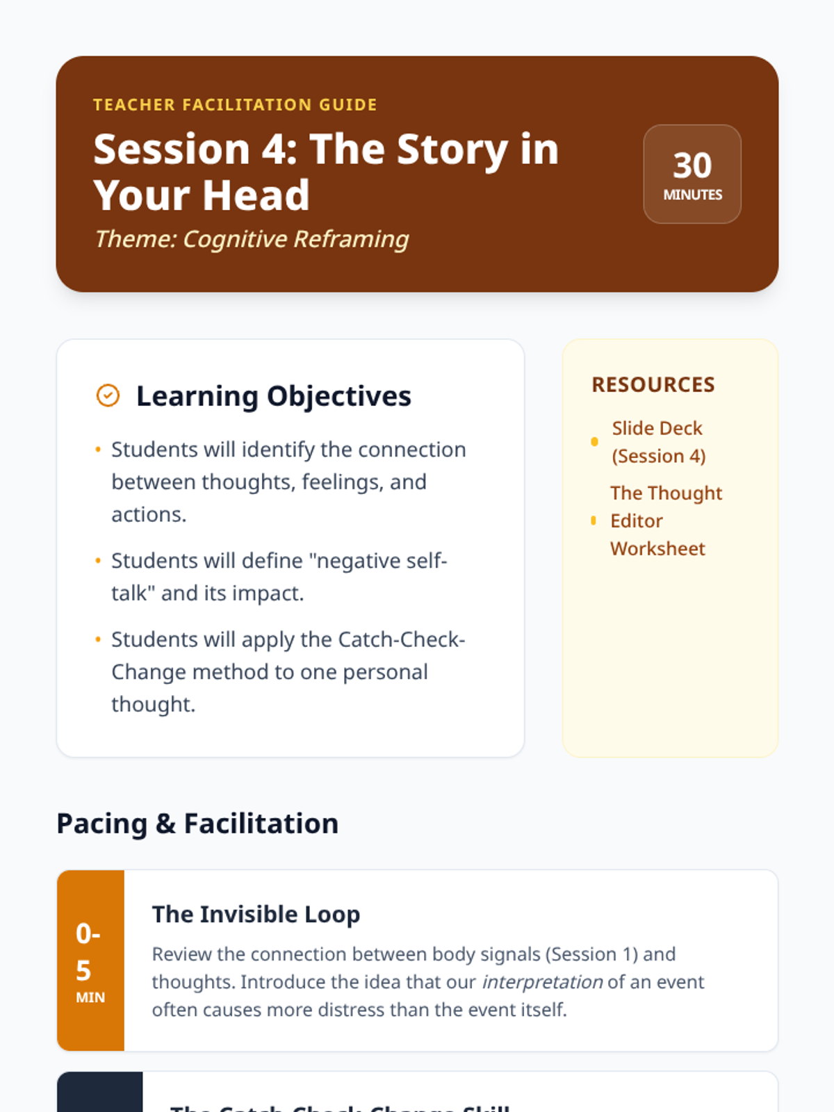 Teacher-facing facilitation guide for Session 4. Provides guidance on explaining the Catch-Check-Change method and helping students distinguish between positive thinking and accurate reframing.