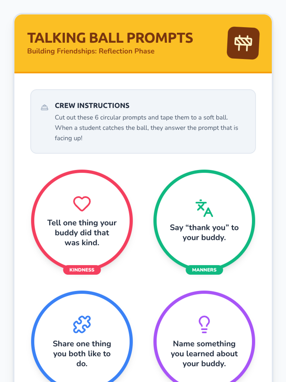 A set of 6 printable circular prompts designed to be attached to a soft ball, facilitating conversation and reflection in the Buddy Builders lesson.