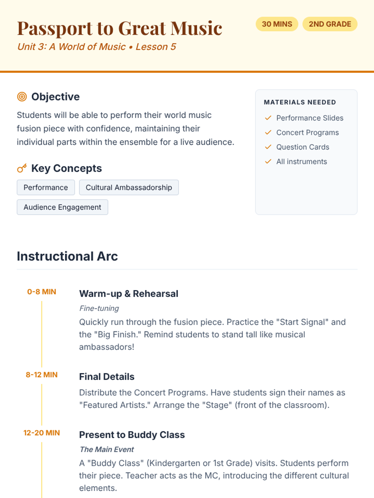 Lesson plan for Lesson 5, focusing on performance and cultural ambassadorship, guiding students to perform their world music fusion piece for an audience.