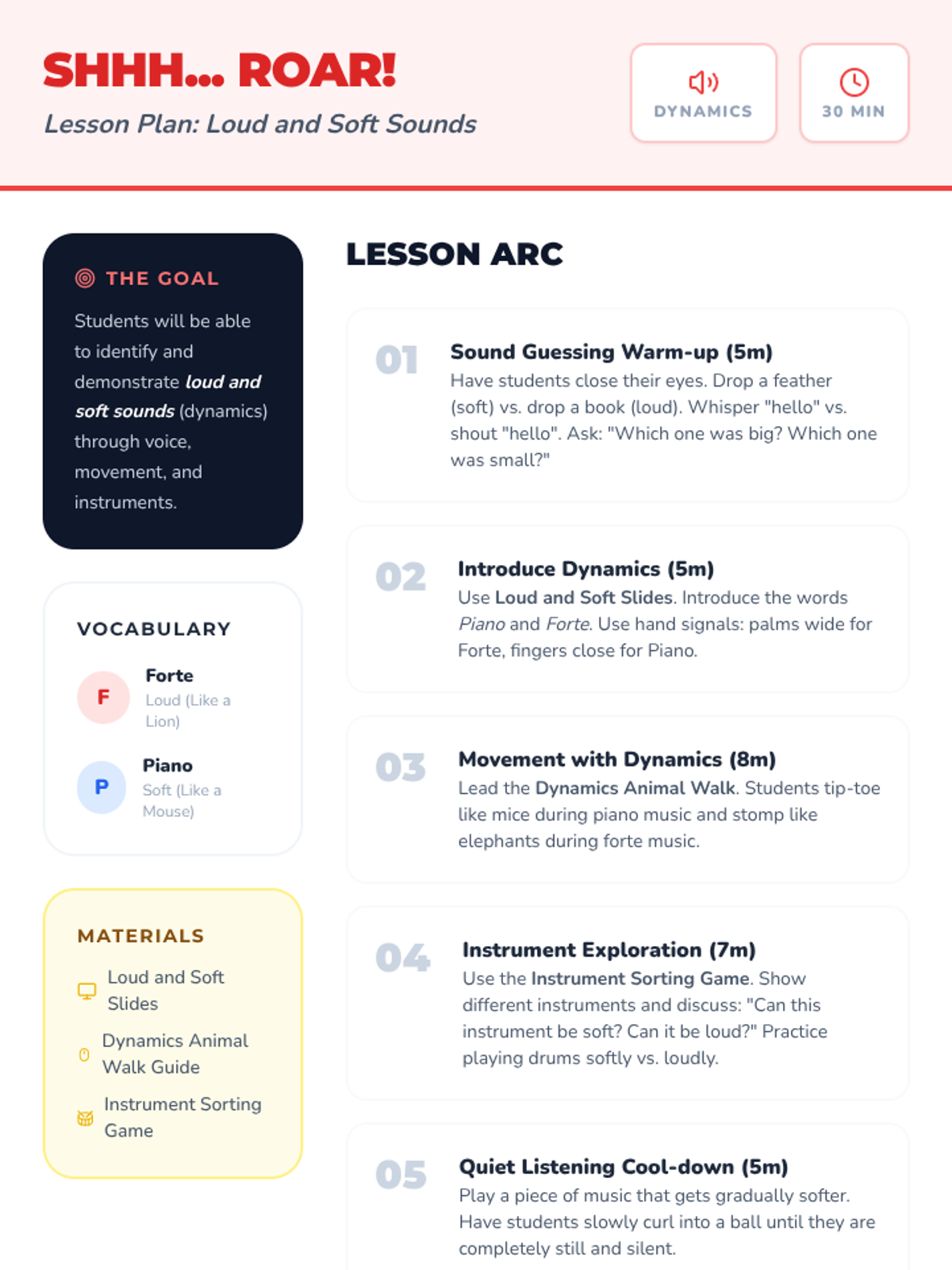 A Kindergarten lesson plan for exploring dynamics (volume) through contrast, movement, and instrument play.