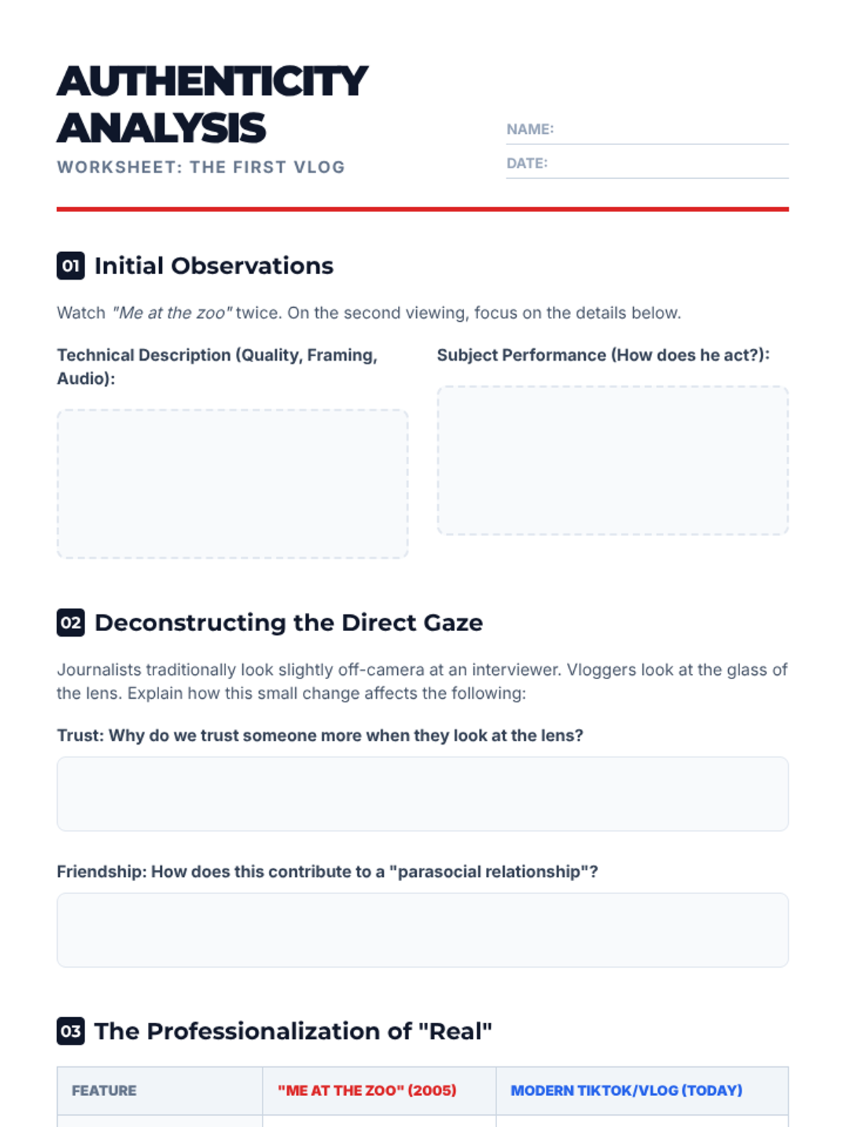 A student worksheet for the 'Art of the Vlog' lesson, featuring observation boxes, a comparison table, and critical thinking prompts about authenticity and parasocial relationships.