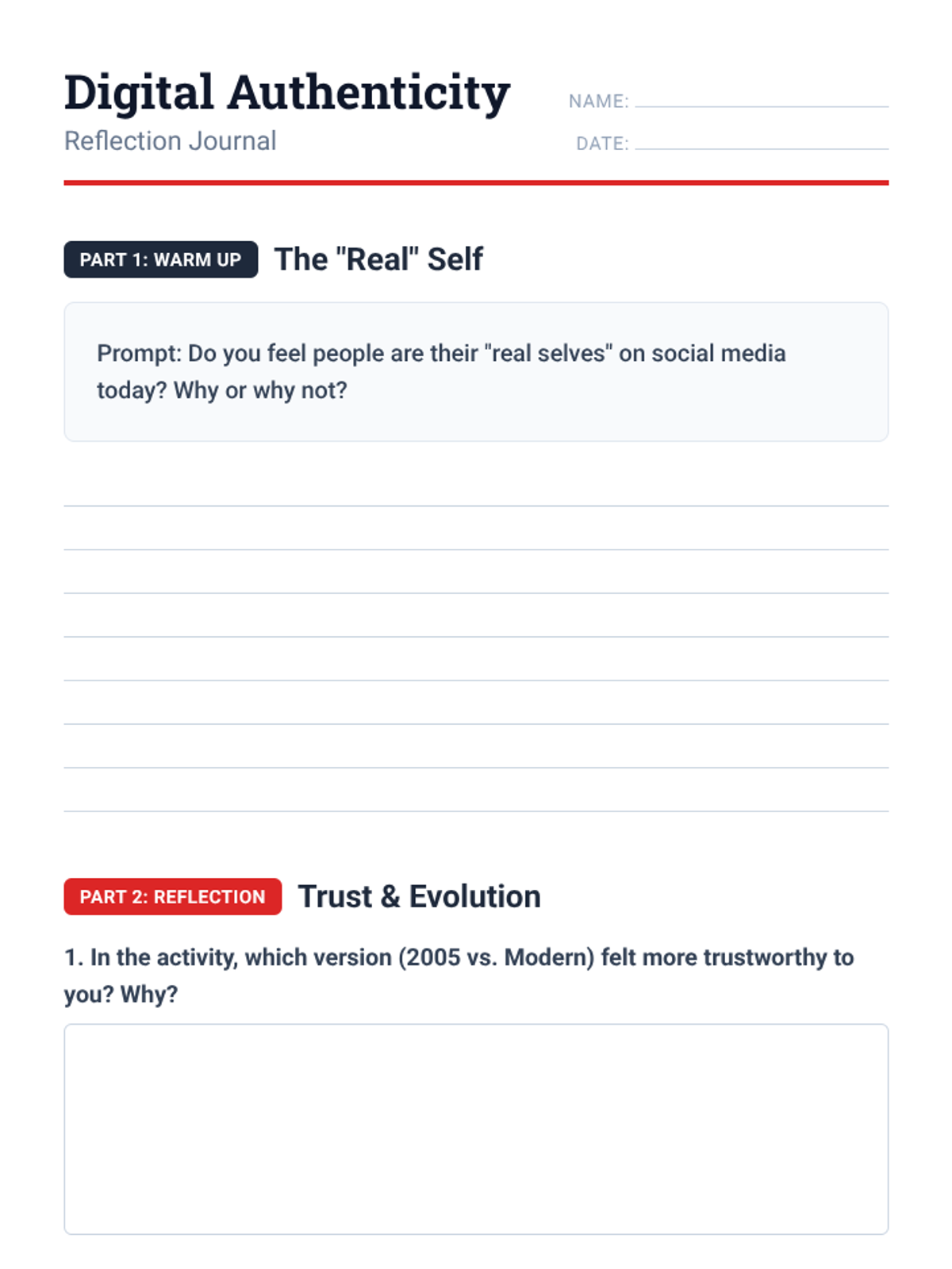 A worksheet containing the warm-up journal prompt and post-activity reflection questions regarding authenticity in social media.
