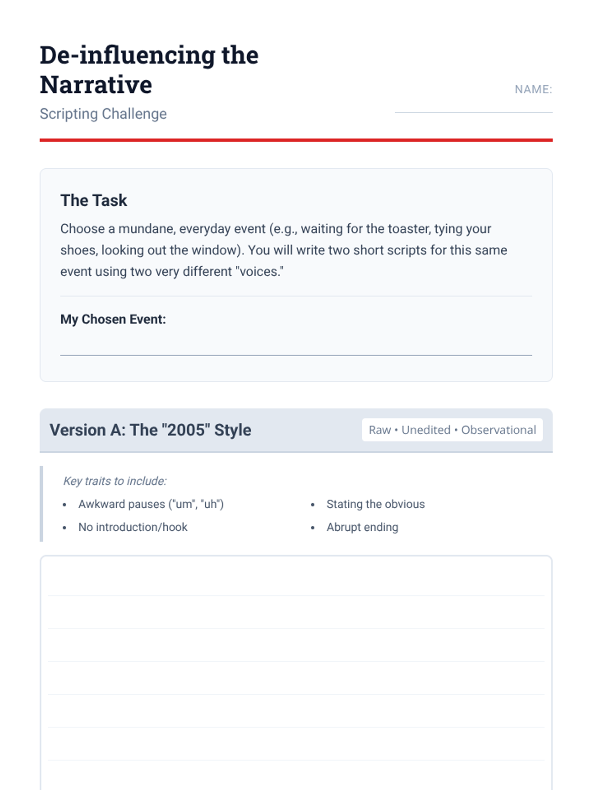 A structured worksheet for students to script their two versions of an event: one in the style of 2005 observational video and one in the style of a modern influencer.
