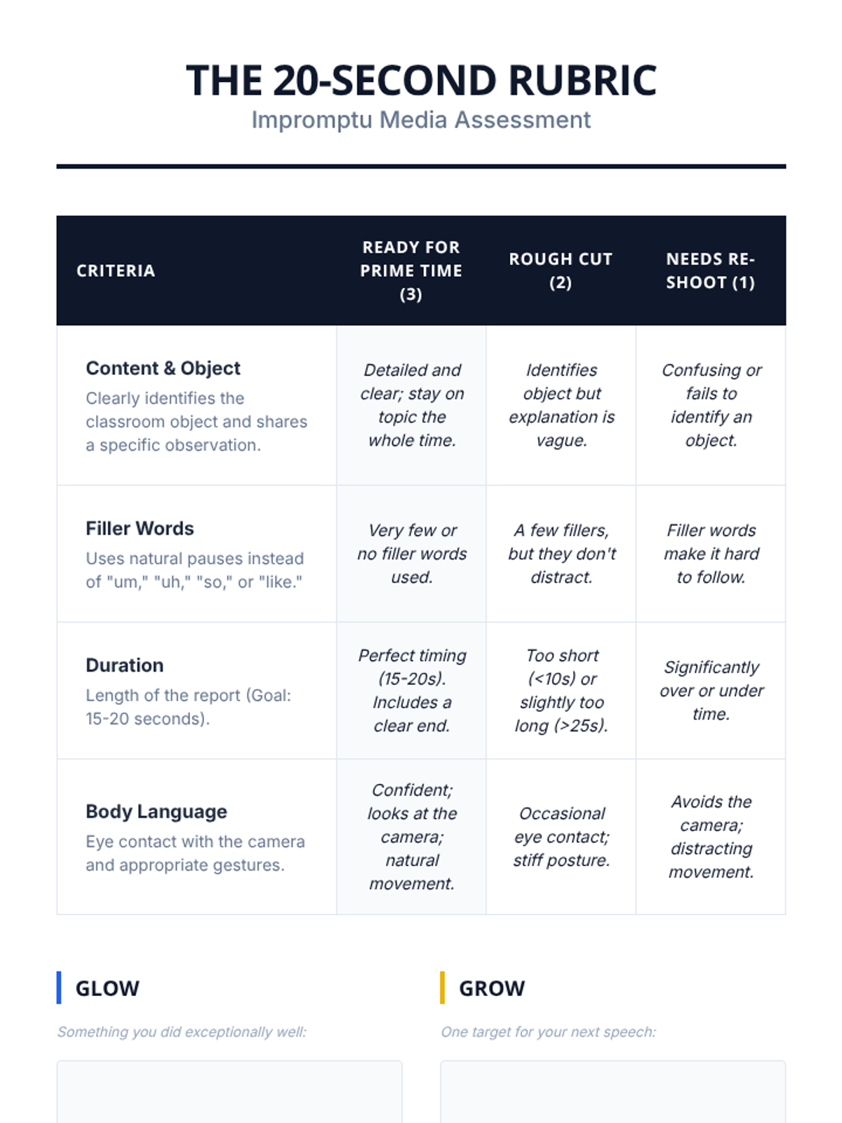A specialized rubric for evaluating impromptu 20-second reports, focusing on content, filler words, timing, and body language.