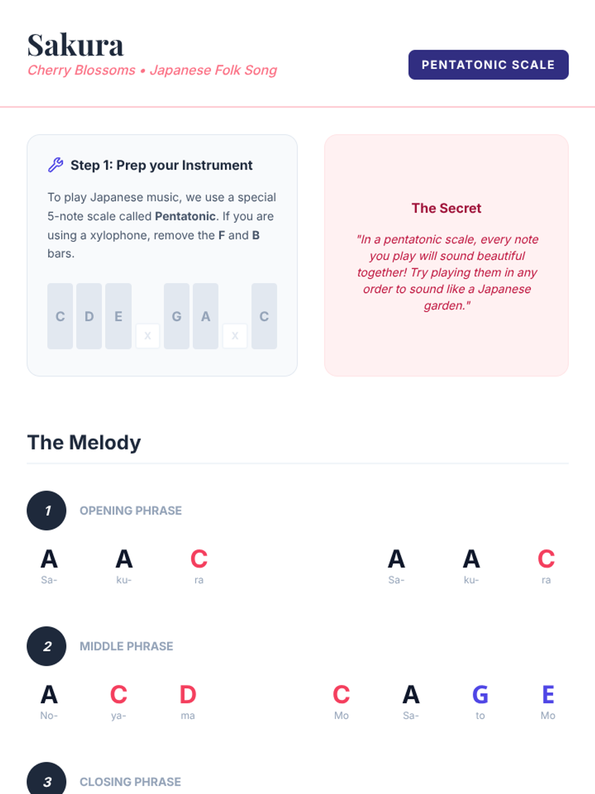 Simple xylophone melody sheet for 'Sakura', using letter names and a pentatonic scale guide for students to perform the traditional Japanese song.