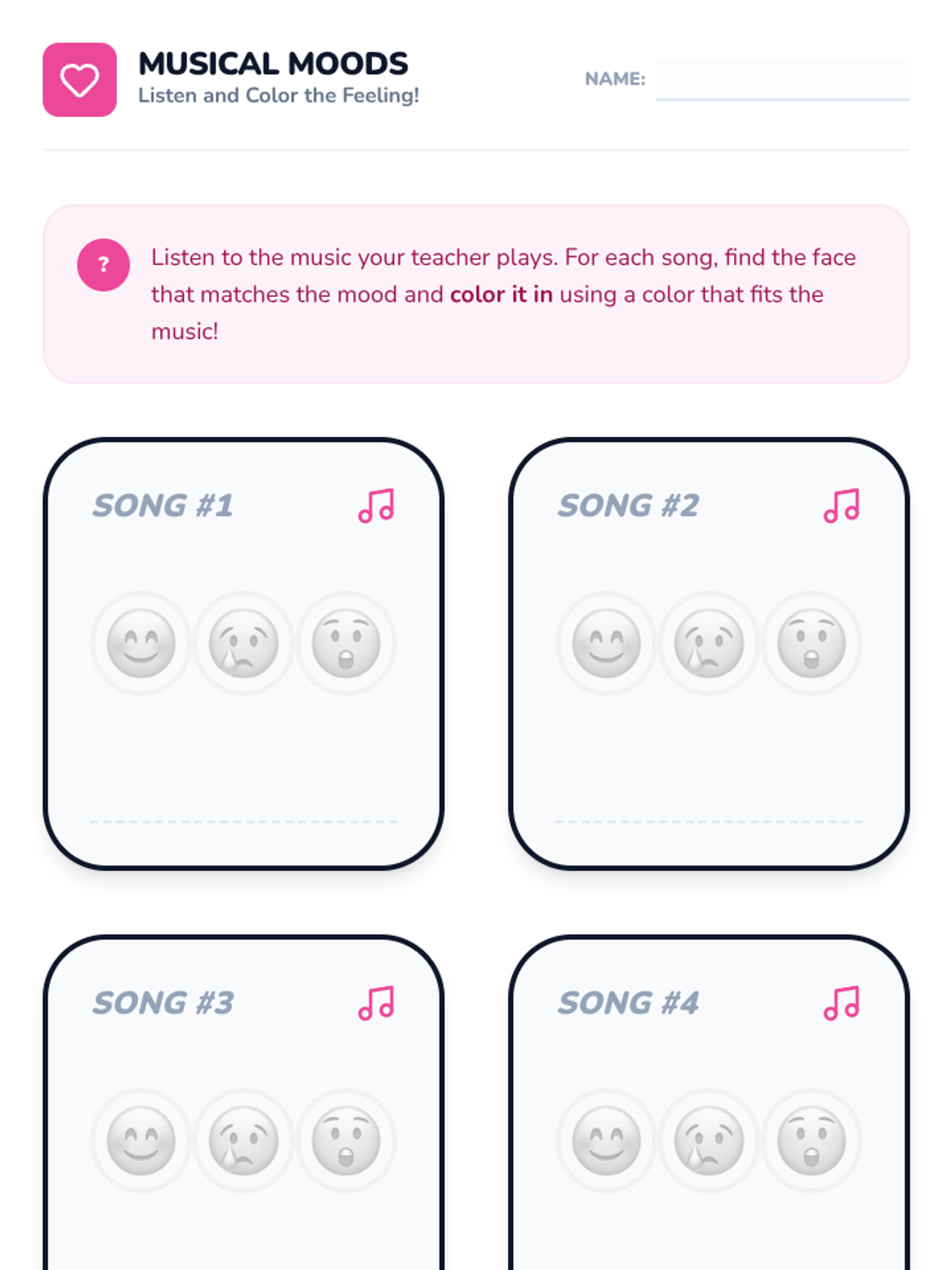 A visual worksheet for Kindergarteners to identify musical moods by coloring emoji faces and associating colors with sounds.
