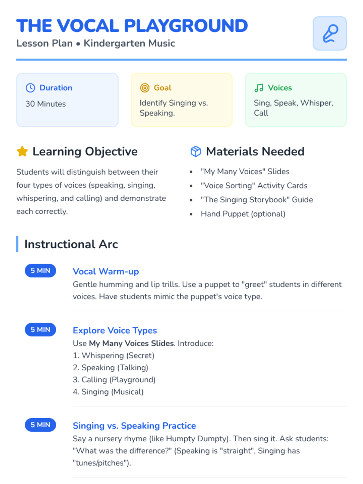 Lesson plan for Lesson 5: The Many Sounds Your Voice Can Make, exploring the four main voice types used in music and communication.