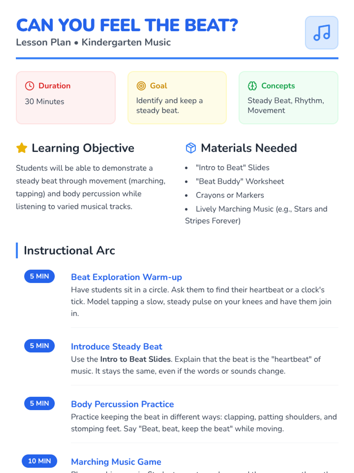 Comprehensive lesson plan for Lesson 1: Can You Feel the Beat? including instructional steps, objectives, and differentiation strategies.