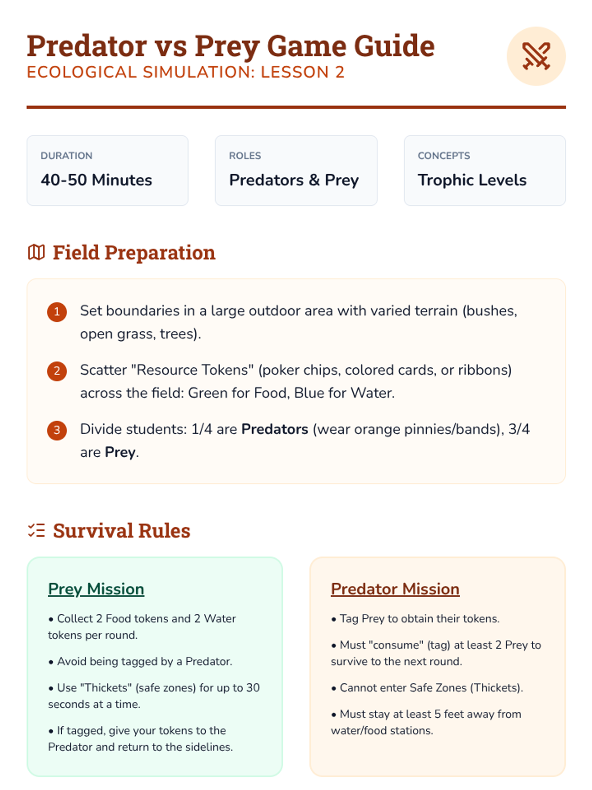 A comprehensive teacher guide for the Predator vs Prey ecological simulation game, including setup instructions, role descriptions, and discussion prompts.