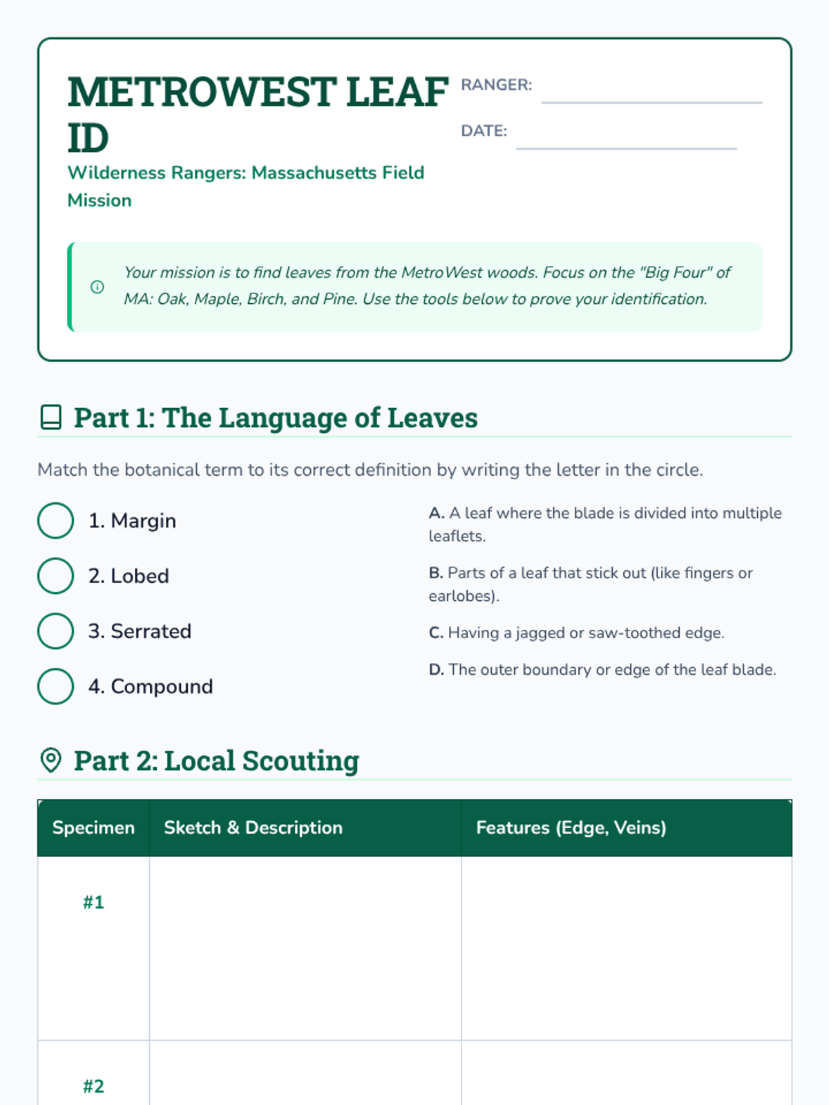A leaf identification worksheet specifically designed for the MetroWest Massachusetts region, featuring local species like Eastern White Pine and Northern Red Oak.