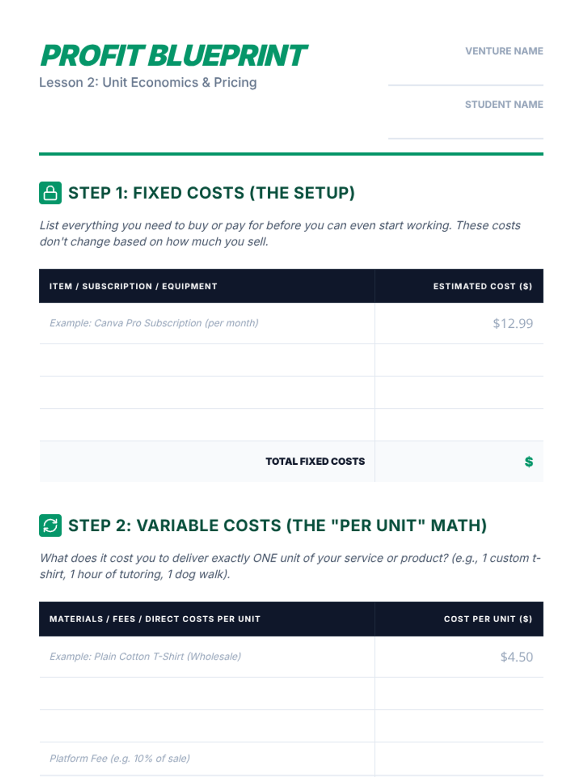 A 2-page student worksheet for Lesson 2 that guides students through calculating fixed costs, variable costs, pricing, unit profit, and break-even points.