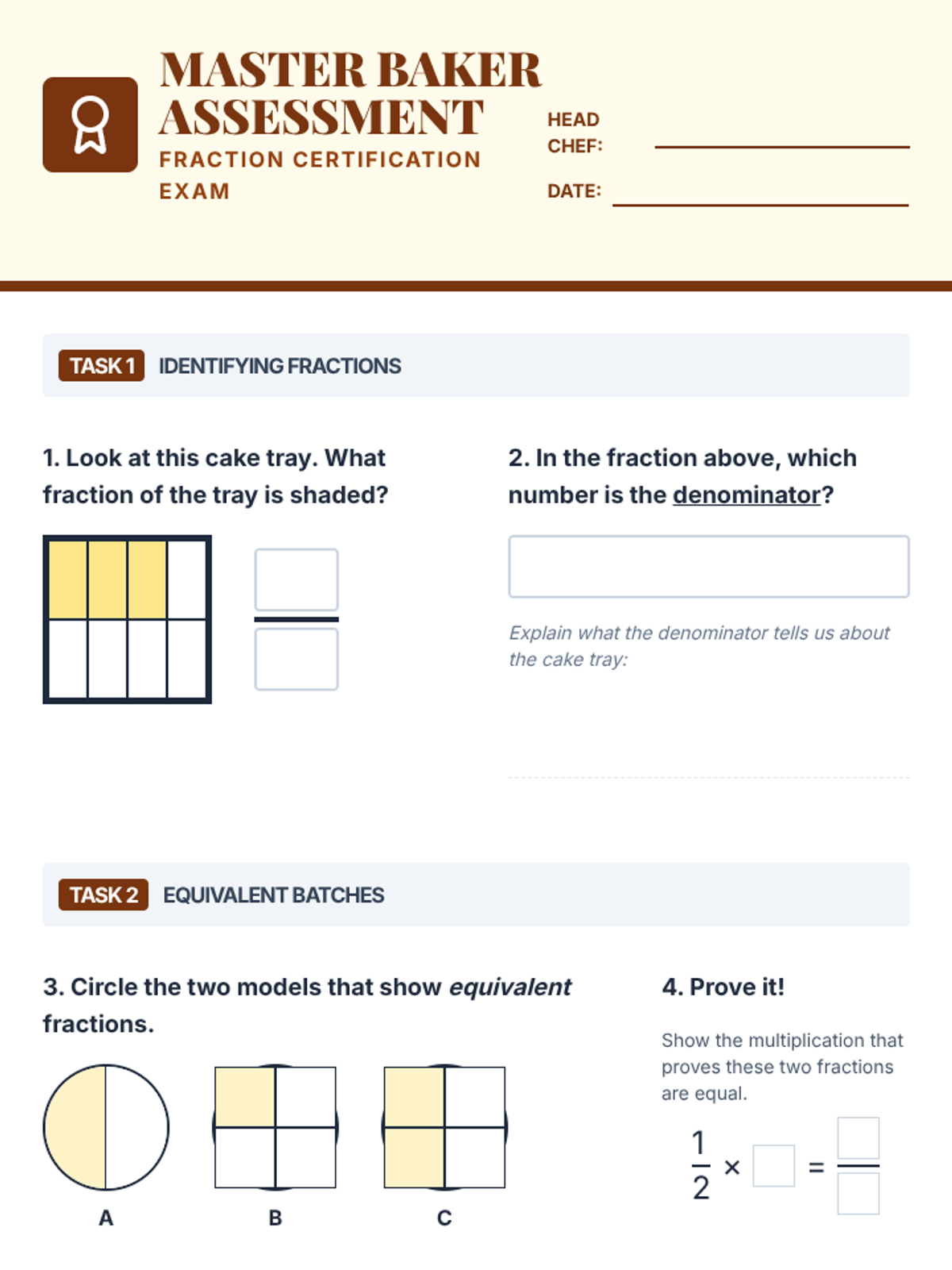 A comprehensive 3-lesson unit for 4th graders introducing fractions as parts of a whole, exploring equivalent fractions, and concluding with a formal assessment. The unit uses a 'Bakery' theme to make abstract concepts concrete and engaging.