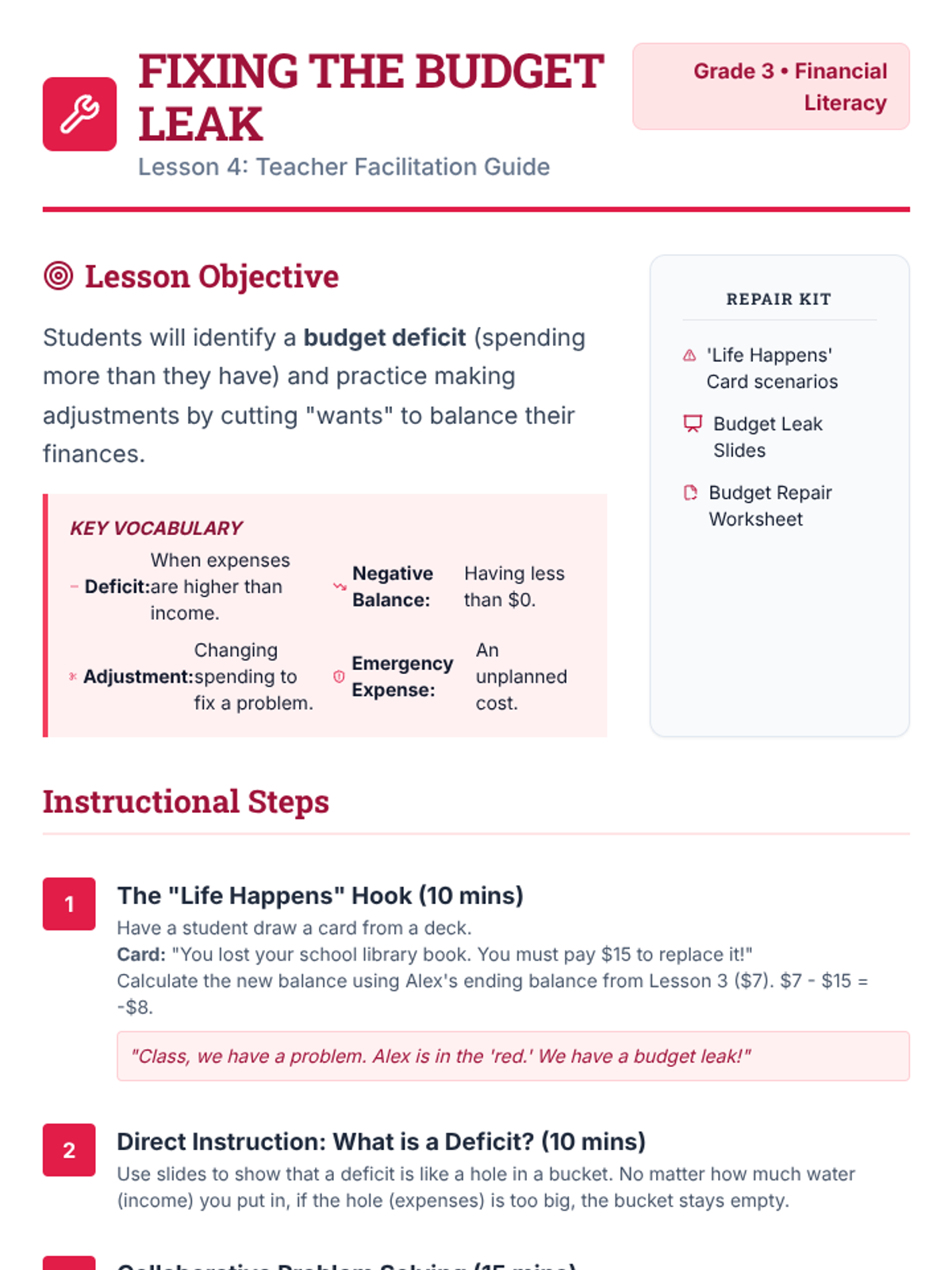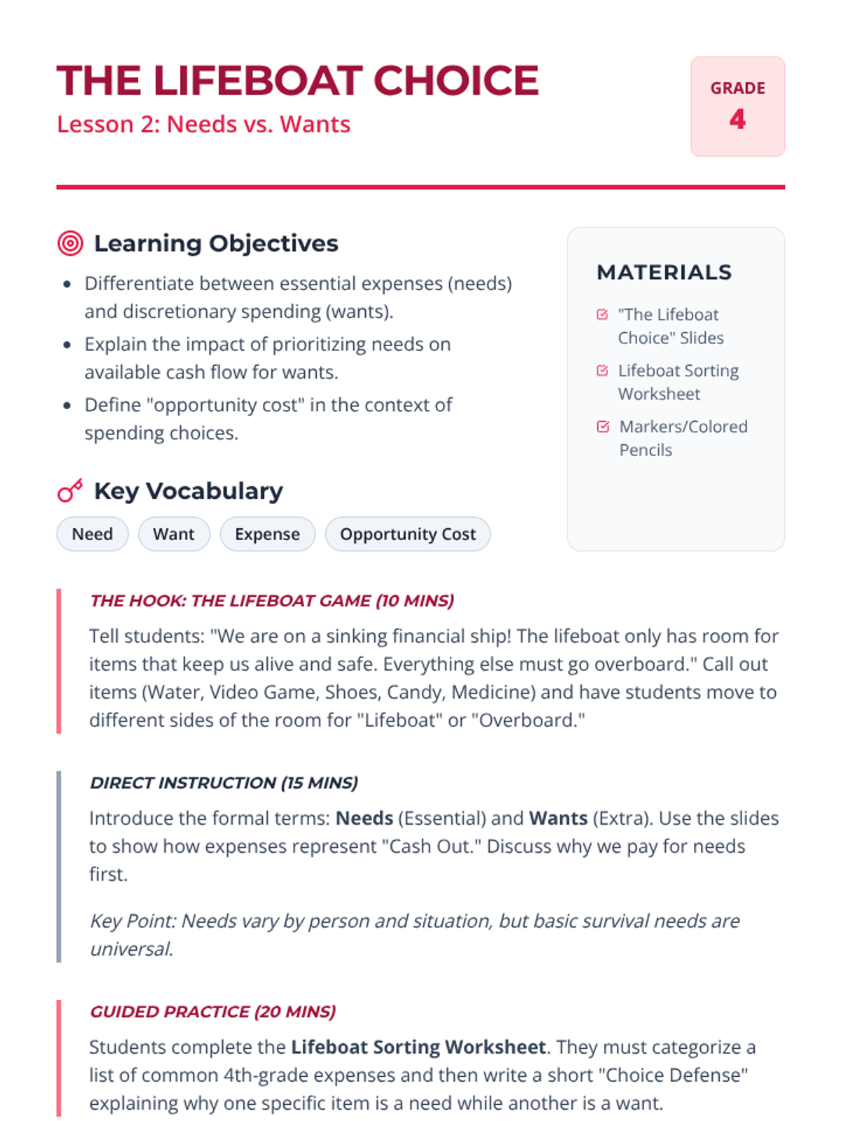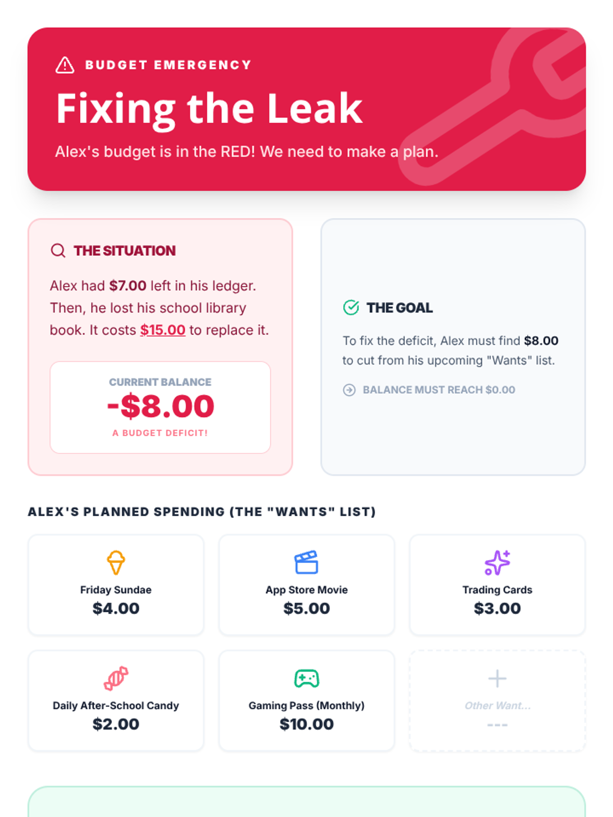 A comprehensive sequence for 3rd graders to master personal cash flow. Students learn to track income and expenses, prioritize needs over wants, and adjust budgets to meet savings goals through the fictional journey of Alex's weekly budget.
