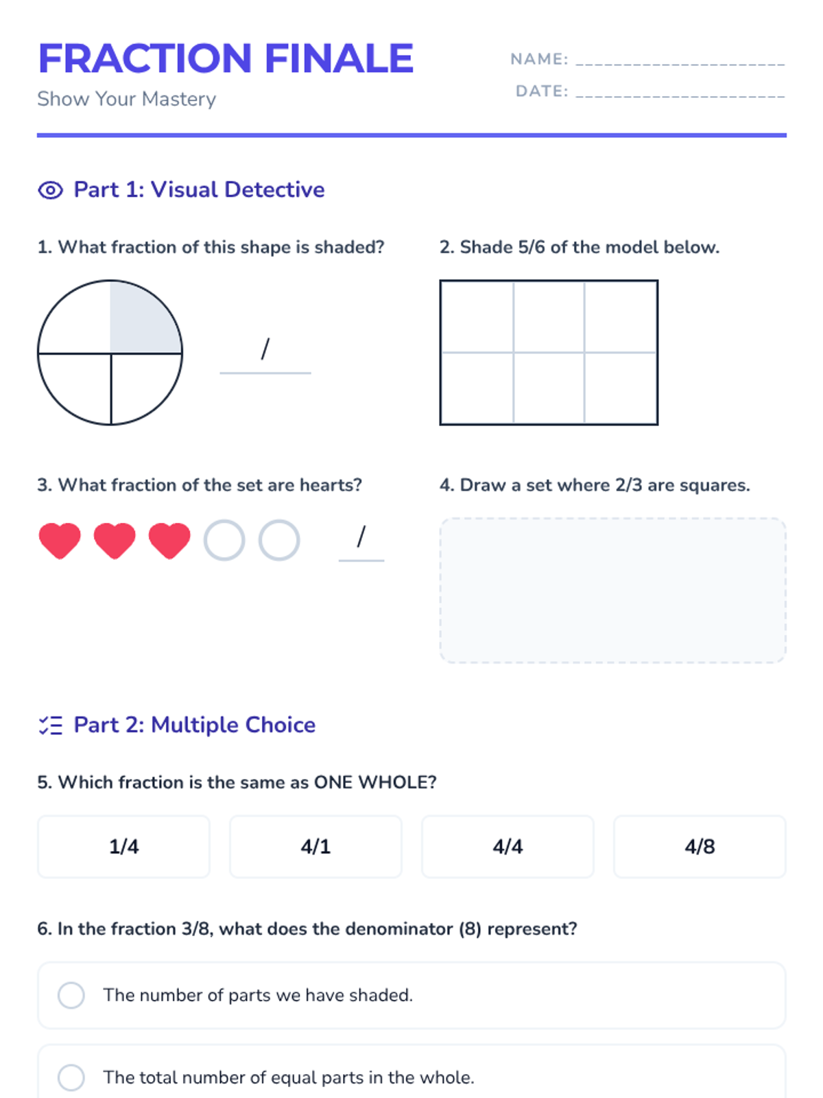 A comprehensive introduction to fractions for 4th graders, moving from visual parts-of-a-whole to equivalent fractions and concluding with a performance-based assessment.